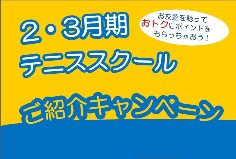 共有: facebook-f icon Twitter icon 2月期、3月期限定!スクール生紹介キャンペーン 付与されるポイントは、レンタルコート・ショップ・レッスン振替手数料・オートテニスにて使用できます。また隣接の江坂ゴルフセンターも共通ポイントのため、打席(打ち放題は対象外)・レストランにて使用できます。